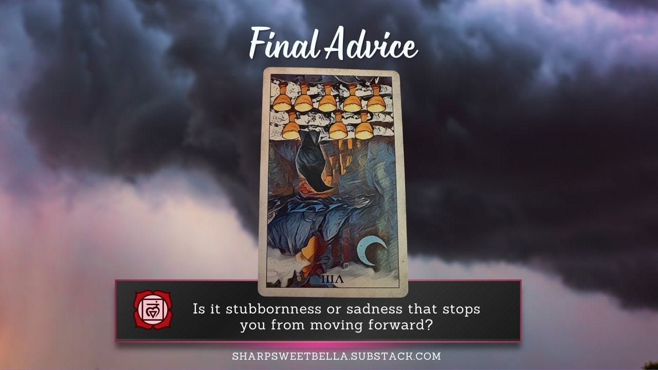 The eight of cups is a goodbye - how permanent it is will be up to us. These are about our emotional connections, even our deep, soul loves, but also our ancestral patterns. If you find yourself going back to the same well over and over again, you have to ask Why do I keep doing this to myself? We cannot change anyone else, but we can open a new door for ourselves. If you find yourself going through an unsatisfying revolving door, stop to assess whether it’s stubbornness or sadness causing you to continue reaching back? What will it take to finally surrender this chase?