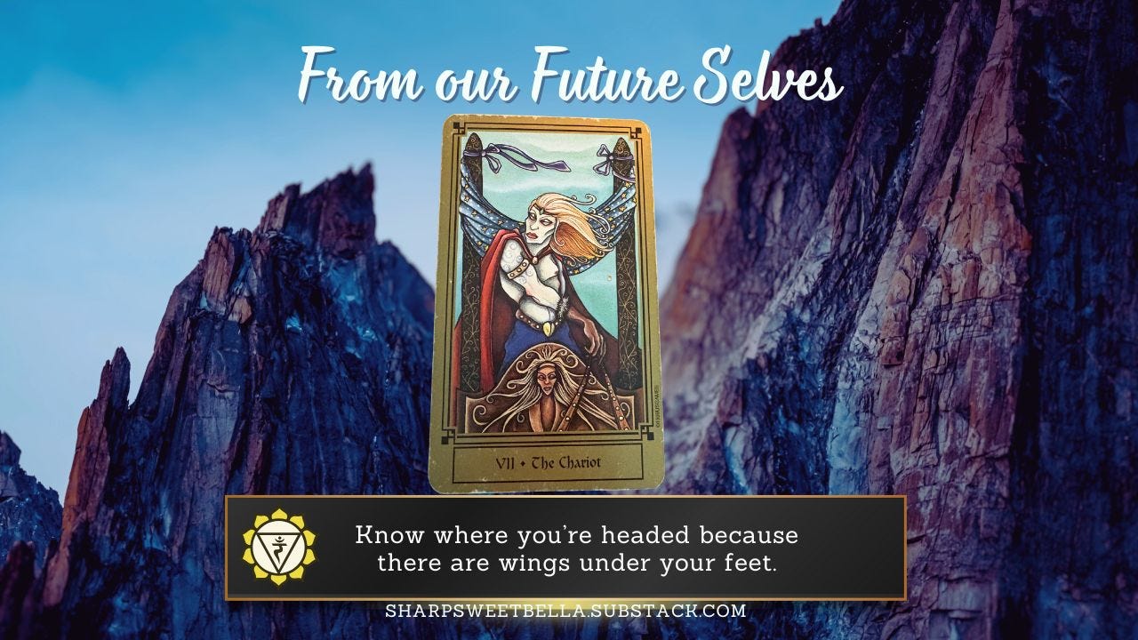 Mother Mary suggests that the best way for us to move from our past selves, here represented by the Crown Chakra/Temperance card to our future selves (Solar Plexus/Chariot energy), is to engage in the attitude of the eternal student. Become a seeker of knowledge, thirsty for skills that you can add to your repertoire. You are already skilled as it is, but this is a way to distinguish your talent so that it can spread a little further, and go a little deeper. For example, learning a different language makes you a more useful volunteer at the food bank. Learning how to write grants helps your neighborhood when they apply for state resiliency funds to help backyard gardeners. You never know when that skill will be useful, so just follow those threads and acquire knowledge to diversify the impact of your presence in any space.