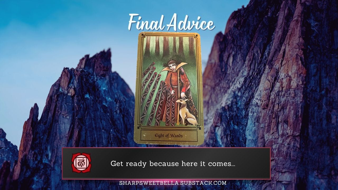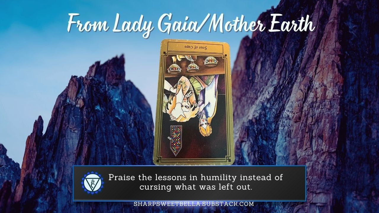 Look, there’s few good things that come out of the four of cups - it’s either complacency or it’s complaining. Either way, it gives off “meh” energy that isn’t very useful right now. So Mother Earth asks us to transform that “meh” feeling into gratitude. Praise the lessons in humility that come along the way to bring in better ones. I’m getting a sense that you’re not feeling very rewarded for the effort you’ve put forth - but the point wasn’t in the recognition it was in building the muscle memory to make the good deeds a habit, not an exception. It doesn’t matter how good you are or how true your intentions are; sometimes, you just have to roll with the practice rounds before you get to claim your prize.